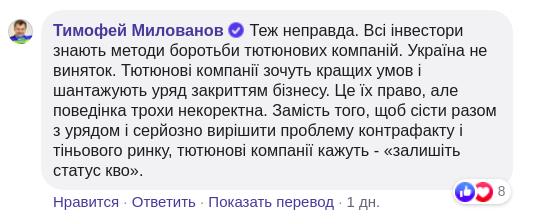 Министр развития экономики, торговли и сельского хозяйства Тимофей Милованов заявил, что после изменений в законодательстве табачные компании шантажируют украинское правительство. Он сказал это, отвечая в Facebook на комментарий одного из пользователей.