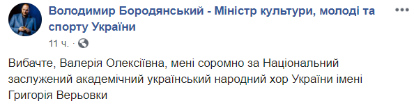 "Простите, Валерия Алексеевна, мне стыдно за национальный заслуженный академический украинский народный хор Украины имени Григория Веревки", - написал Бородянский в Facebook.