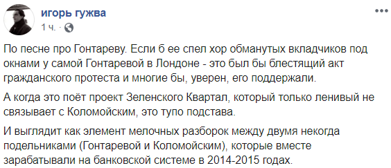 "По песне про Гонтареву. Если б ее спел хор обманутых вкладчиков под окнами у самой Гонтаревой в Лондоне - это был бы блестящий акт гражданского протеста и многие бы, уверен, его поддержали.