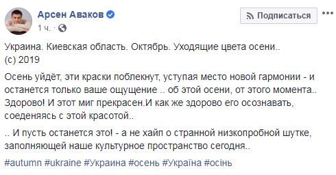 Также он предложил перевести внимание с "хайпа о странной низкопробной шутке" на "уходящие цвета осени", приложив фотографию пейзажа в Киевской области. "И пусть останется это (ощущение осени). А не хайп о странной низкопробной шутке, заполняющей наше культурное пространство сегодня", - написал глава МВД.