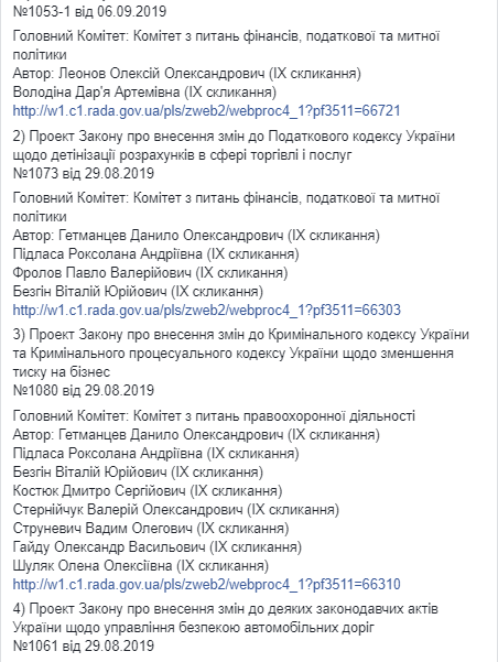 1) Проект Закона о внесении изменений в Закон Украины "О применении регистраторов расчетных операций в сфере торговли, общественного питания и услуг" относительно детенизации расчетов в сфере торговли и услуг