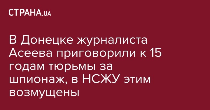 Национальный союз журналистов Украины заявил, что "возмущен судилищем над украинским журналистом, публицистом Станиславом Асеевым", которого сегодня "Апелляционная палата Верховного суда ДНР" приговорила к 15 годам лишения свободы за "шпионаж и призывы к экстремистской деятельности". Об этом говорится в заявлении НСЖУ, обнародованном во вторник.
