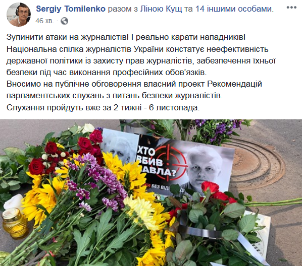 "Национальный союз журналистов Украины констатирует неэффективность государственной политики по защите прав журналистов, обеспечения их безопасности во время выполнения профессиональных обязанностей. Вносим на публичное обсуждение свой проект Рекомендаций парламентских слушаний по вопросам безопасности журналистов. Слушания пройдут уже через 2 недели - 6 ноября", - написал Сергей Томиленко.