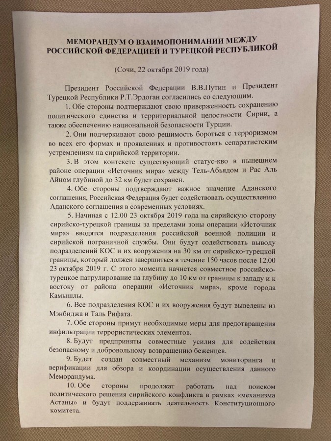 Вчера президенты России и Турции встретились и подписали соглашение об окончании операции Анкары в Сирии.