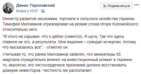 "Учитывая то, что ранее Милованов заявлял, что миниатюры 95 квартала отрицательно влияют на инвестиционный климат в Украине, то, вероятно, его чистосердечное признание должно восстановить доверие инвесторов. Честность же располагает" - написал блогер Денис Гороховский.