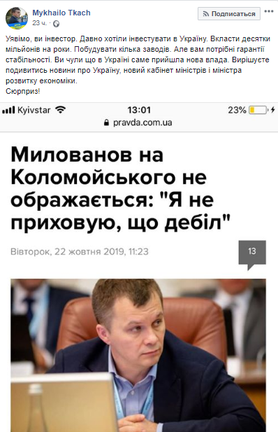 "Предположим, вы инвестор. Давно хотели инвестировать в Украину. Вложить десятки миллионов на годы. Построить несколько заводов. Но вам нужны гарантии стабильности. Вы слышали что в Украине именно пришла новая власть. Решаете посмотреть новости об Украине, новый кабинет министров и министра развития экономики. Сюрприз!" - написал журналист Михаил Ткач.