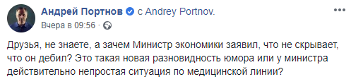 "Друзья, не знаете, а зачем Министр экономики заявил, что не скрывает, что он дебил? Это такая новая разновидность юмора или у министра действительно непростая ситуация по медицинской линии?" - интересуется юрист Андрей Портнов.