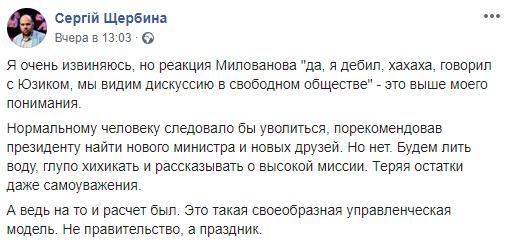 "Я очень извиняюсь, но реакция Милованова "да, я дебил, хахаха, говорил с Юзиком, мы видим дискуссию в свободном обществе" - это выше моего понимания.