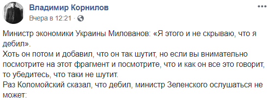 Тот в ответ не постеснялся назвать Милованова дебилом. В свою очередь министр экономики пошутил, что он никогда и не скрывал, что дебил.