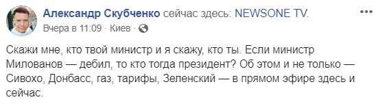 "Скажи мне, кто твой министр и я скажу, кто ты. Если министр Милованов — дебил, то кто тогда президент?", - пишет блогер Александр Скубченко.