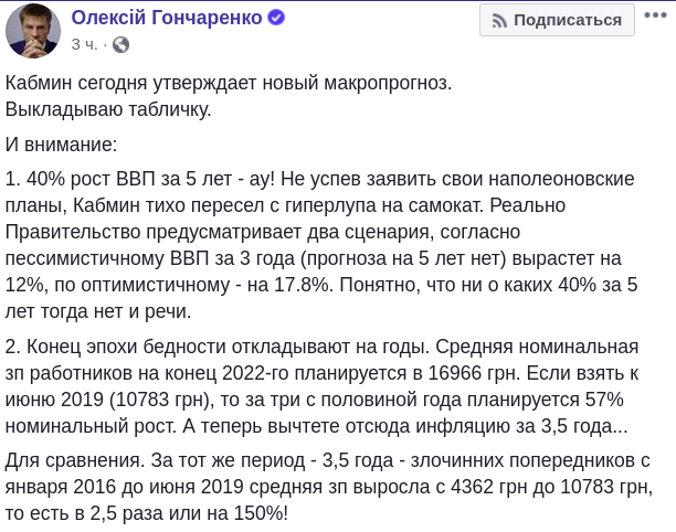 Рост ВВП Украины в ближайшие три года не будет выше, чем 4% в год. Об этом сказано в таблице обновленного макропрогноза Кабинета министров, опубликованной нардепом Алексеем Гончаренко на своей странице в Facebook в среду, 23 октября.