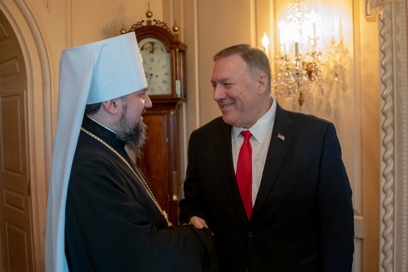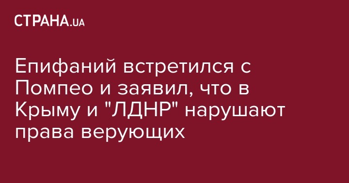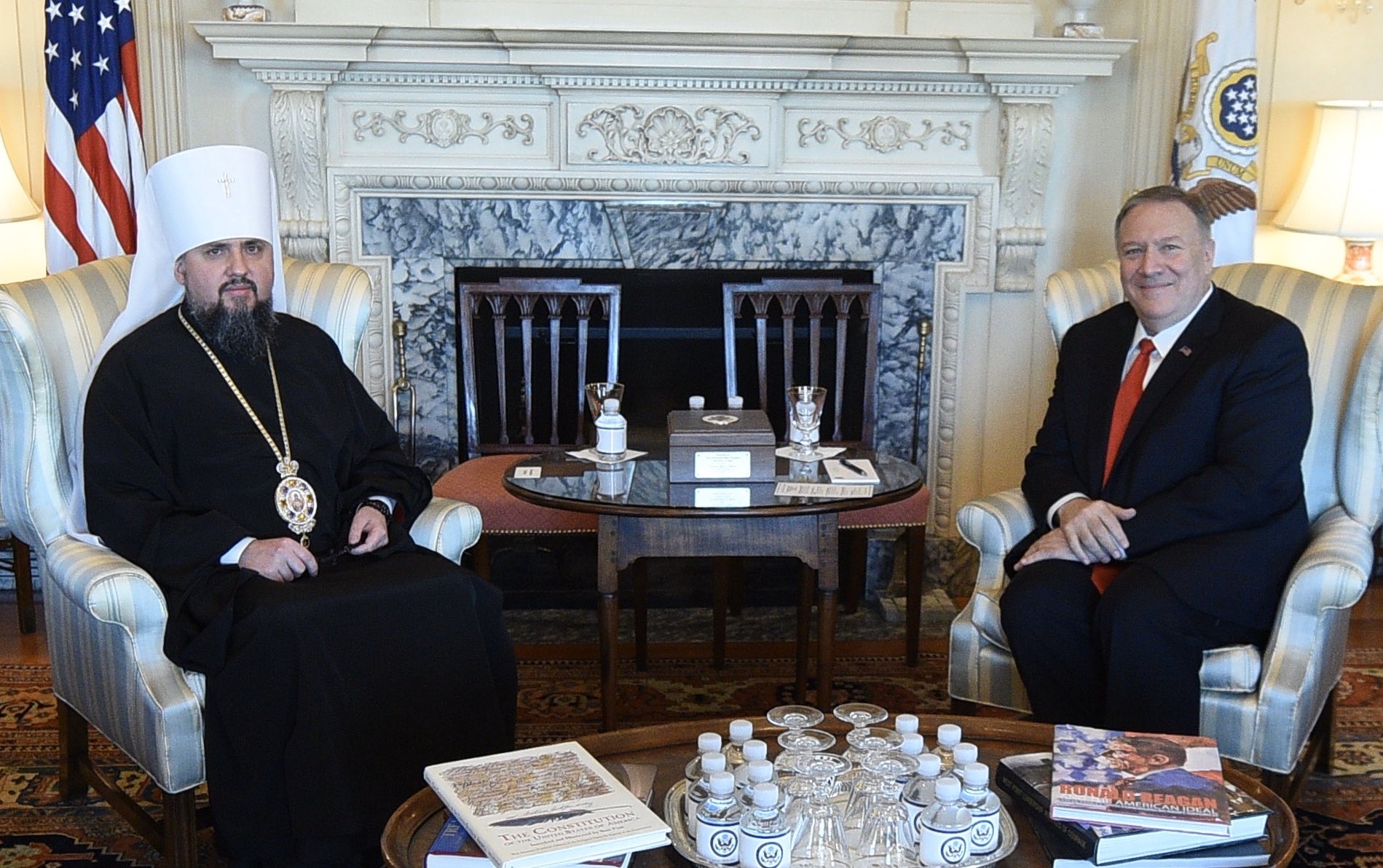 Глава ПЦУ Епифаний во время визита в США встретился с госсекретарем США Майком Помпео и заявил о нарушении религиозных свобод в так называемых "ЛДНР" и Крыму.