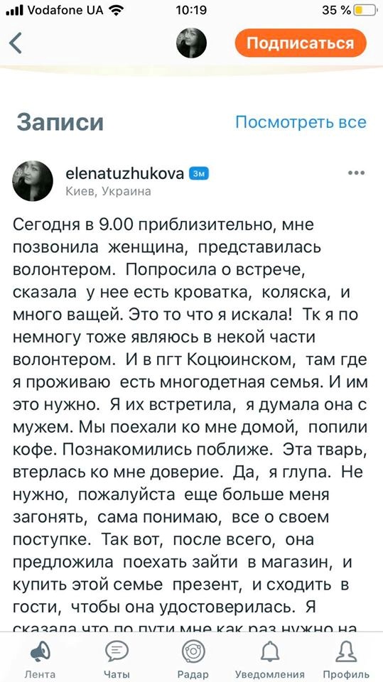 Утром 23 октября в пгт Коцюбинское девушка, которая представилась волонтером, встретилась с малоимущей семьей и сказал, что хочет помочь.