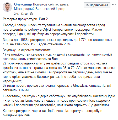 "За два дня: 1 088 прокуроров, из которых проходят дальше 774, не сдали экзамен 197, не явились 117. Отсев составляет 29%", - написал Леменев.