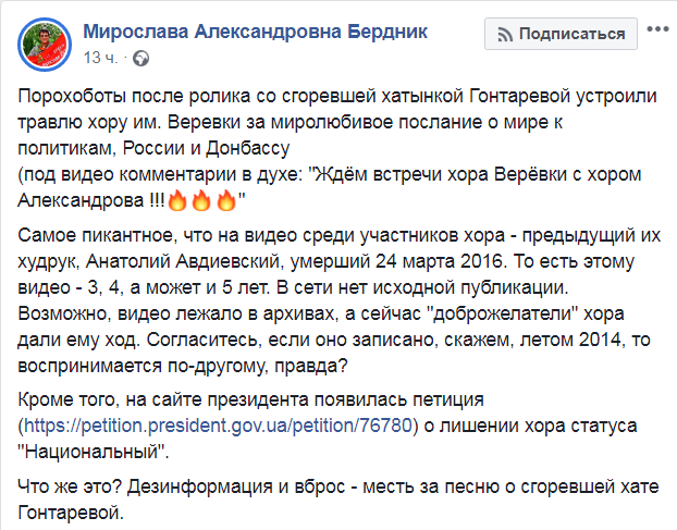 "Что же это? Дезинформация и вброс - месть за песню о сгоревшей хате Гонтаревой... Возможно, видео лежало в архивах, а сейчас "доброжелатели" хора дали ему ход. Согласитесь, если оно записано, скажем, летом 2014, то воспринимается по-другому, правда?" - сказано в посте Бердник.