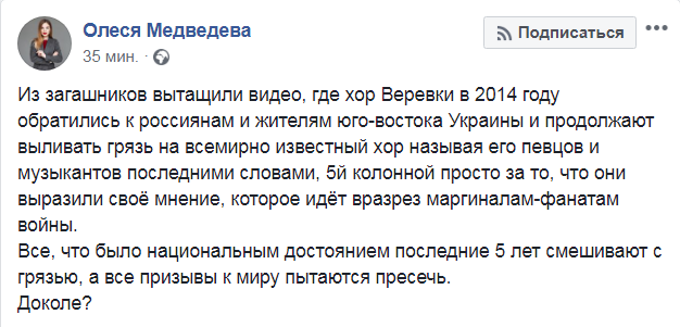"Из загашников вытащили видео, где хор Веревки в 2014 году обратился к россиянам и жителям юго-востока Украины. И продолжают выливать грязь на всемирно известный хор, называя его певцов и музыкантов последними словами, 5-й колонной просто за то, что они выразили своё мнение, которое идёт вразрез маргиналам - фанатам войны. Все, что было национальным достоянием, последние 5 лет смешивают с грязью, а все призывы к миру пытаются пресечь. Доколе?" - пишет Олеся.