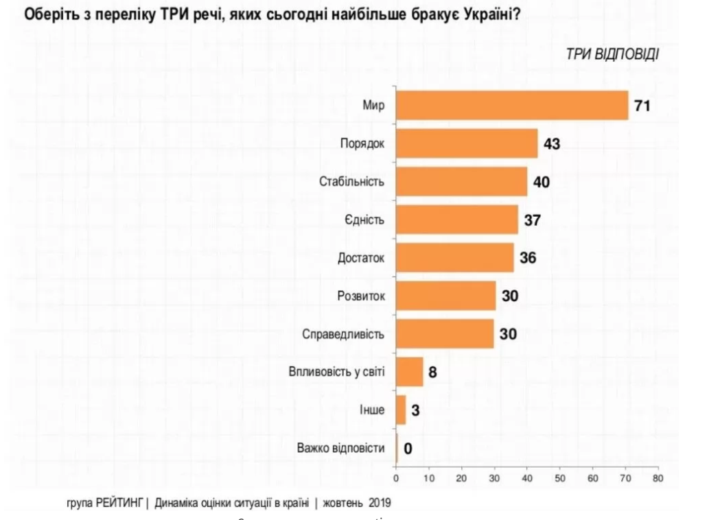"71% отметили, что сегодня Украине больше всего не хватает мира. 43% - считают, что Украине нужен порядок, 40% - стабильность, 37% - единство, 36% - достаток, по 30% - развитие и справедливость, 8% - влиятельность в мире. Запрос на все перечисленные категории за последние три месяца вырос, больше всего - в отношении мира и порядка", - говорится в тексте опроса, опубликованного в четверг на сайте "Рейтинга".