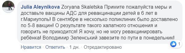 Юлия Олейникова обратилась к министру здравоохранения Зоряне Скалецкой в соцсети с просьбой принять меры и доставить вакцины АДС для ревакцинации детей в 6 лет в Мариуполь.