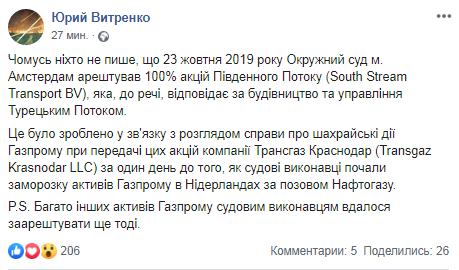23 октября Окружной суд Амстердама арестовал акции "Южного потока". Об этом исполнительный директор "Нафтогаза" Юрий Витренко написал в Facebook.