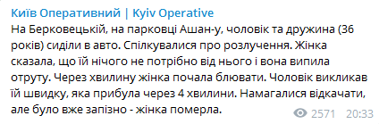 В Киеве, возле гипермаркета "Ашан" на улице Берковецкой, выпив яд, умерла женщина. Об этом в Telegram-канале сообщает "Киев Оперативный".