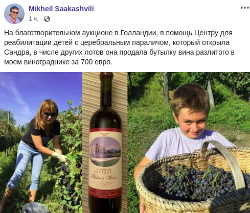 "На благотворительном аукционе в Голландии, в помощь Центру для реабилитации детей с церебральным параличом, который открыла Сандра, в числе других лотов она продала бутылку вина разлитого в моем винограднике за 700 евро" - написал политик.
