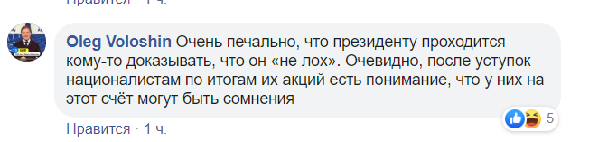 "Очень печально, что президенту проходится кому-то доказывать, что он "не лох". Очевидно, после уступок националистам по итогам их акций есть понимание, что у них на этот счёт могут быть сомнения", - пишет нардеп Олег Волошин.