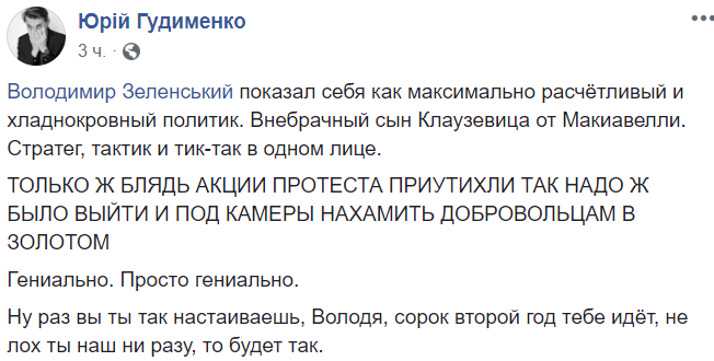 "Только ж ... акции протеста приутихли - так надо ж было выйти и под камеры нахамить добровольцам в Золотом. Гениально. Просто гениально.