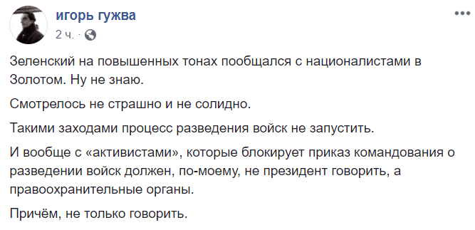 "Зеленский на повышенных тонах пообщался с националистами в Золотом. Ну не знаю.