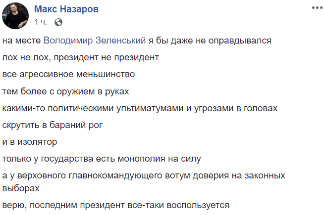 Зеленский: "Денис, по Украине вчера прошел дождь - вот, что я слышал. Какие люди люди? Фамилию ты мне можешь назвать?.. Денис, послушай, я - президент этой страны, мне 42-й год, я ж не лох. Я тебе пришел и сказал: оружие убери. И ты мне не переводи [тему] на акции. Я хотел увидеть в глазах понимание, но увидел парня, какой думал, что перед ним какой-то лопух стоит. Парни, есть демократия, а есть ситуация в стране... Ребята, к вам мы сейчас серьезно обратились. Пожалуйста. Пока".