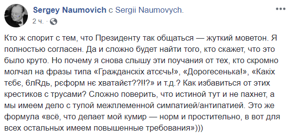 "Кто ж спорит с тем, что Президенту так общаться — жуткий моветон. Я полностью согласен. Да и сложно будет найти того, кто скажет, что это было круто. Но почему я снова слышу эти поучания от тех, кто скромно молчал на фразы типа "Гражданскіх атсєчь!", "Дорогесенька!", "Какіх тєбє, 6лRдь, рєформ нє хватайєт??!!?" и т.д.? Как избавиться от этих крестиков с трусами? Сложно поверить, что истиной тут и не пахнет, а мы имеем дело с тупой межплеменной симпатией/антипатией. Это же формула "всё, что делает мой кумир — норм и простительно, в вот для всех остальных имеем повышенные требования".