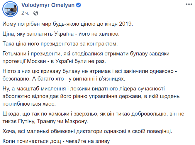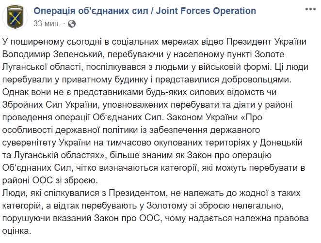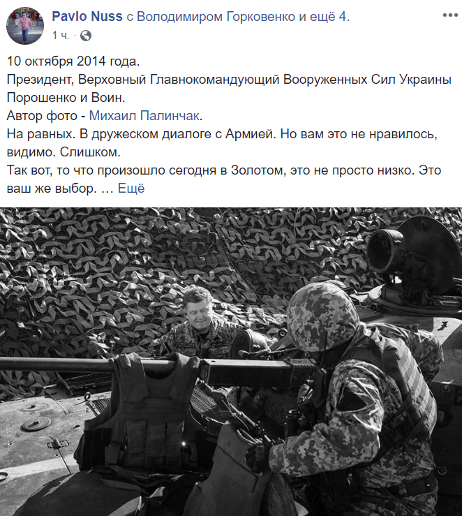 "По встрече президента в Золотом. Видно что встречу для показухи никто не готовил, никто никому заранее не рассказывал, о чем можно говорить и какие вопросы задавать. Тут спорили, не соглашались и даже кричали. Такого простого и открытого общения с солдатами во времена Порошенко с его тёплыми ваннами, подготовленной массовкой и карманными журналистами - даже представить себе было нельзя. Говорили по простому. По человечески. Слушали и слышали друг друга. Основная суть- люди хотят разведения, устали от войны. Большинство украинцев этого хотят, везде.И тут в Золотом. Те кто пытаются сорвать договоренности , играя в политические игры, так называемые "некапитулянты" просто продвигают интересы одного человека и его партии, все понимают кого именно. У государства и ее армии должно оставаться право на поддержание закона , так должно быть.И так будет.