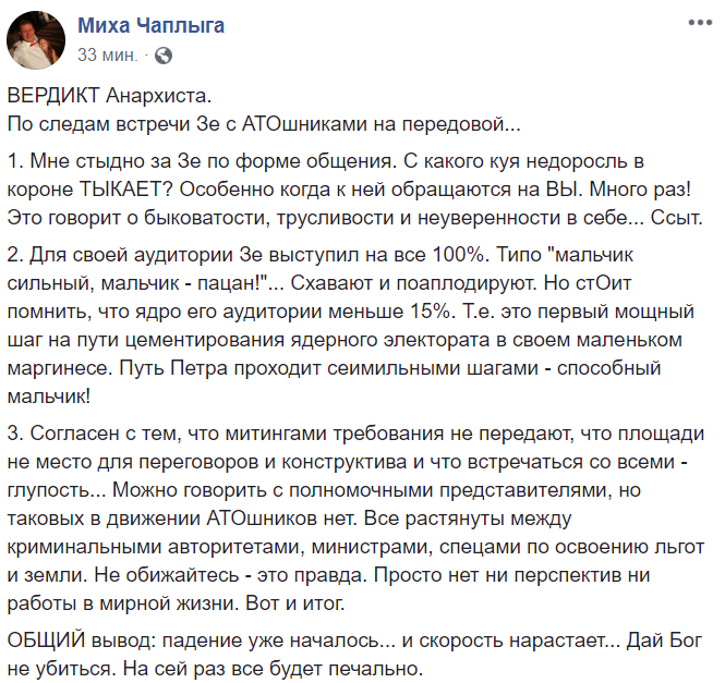 "Можно критиковать Зеленского за то что как лох стал разговаривать с "патриотами" по фене. Однако у этой встречи на мой взгляд, есть другая сторона. В отличие от чучела Порошенка, Зеленский лично приехал, без карманных СМИ, без постановочной массовки, которую постоянно с собой возил Порошенко и как пацан пацанам попытался объяснить, чтобы по нормальному съехали с хаты, иначе будет беда. Считаю что, для восстановления мира, Зеленский должен принять волевое решение и как верховный главнокомандующий отдать приказ об отводе ВСУ. А кто не выполнит приказ, Бог ему судья..." - пишет блогер Валерий Пушилин.