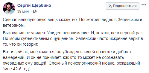 "Сейчас непопулярную вещь скажу, но. Посмотрел видео с Зеленским и ветераном. Быкования не увидел. Увидел непонимание. И, кстати, не в первый раз. По моим субъективным ощущениям, Зеленский часто искренне верит в то, что он говорит. Вот и сейчас, мне кажется, он убежден в своей правоте и доброте намерений. И он не понимает, как кто-то может не осознавать очевидных ему вещей. Сложный психологический нюанс, рождающий "мне 42-й год", - размышляет журналист Сергей Щербина.