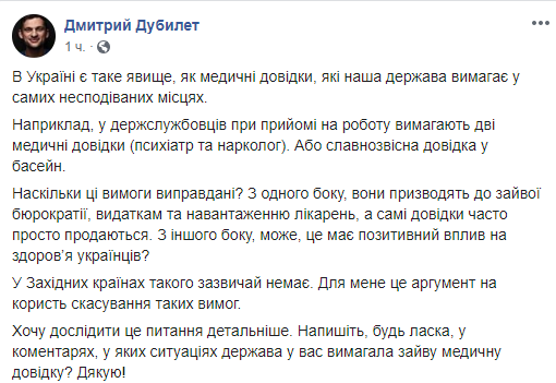 За отмену такого документа, как медицинская справка выступил министр Кабинета Министров Дмитрий Дубилет. Об этом он написал на своей странице в соцсети Facebook.