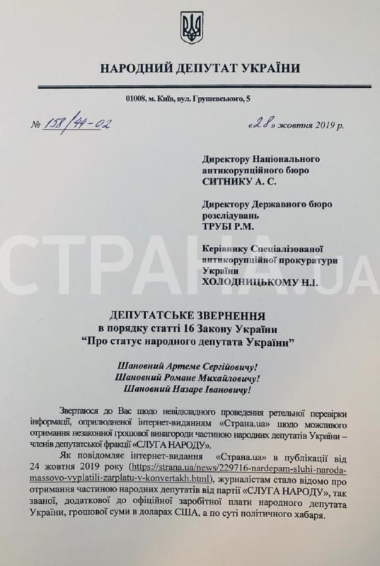 Нардеп ссылается на материал "Страны", где мы рассказали о том, что депутатам от "Слуги народа" выплатили "добавку к зарплате" в конвертах в долларах и без учета налогов.