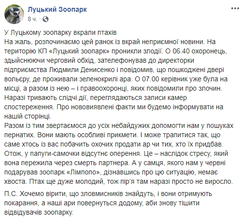 "На территорию КП "Луцкий зоопарк" проникли воры. В 06:40 охранник, совершая очередной обход, позвонил директору предприятия Людмиле Денисенко и сообщил, что повреждены двери вольера, где проживали зеленокрылые ара. В 07:00 руководитель уже была на месте, а вместе с ней - и правоохранители, которым сообщили о преступлении. Сейчас продолжаются следственные действия, пересматриваются записи камер наблюдения", - говорится в сообщении.