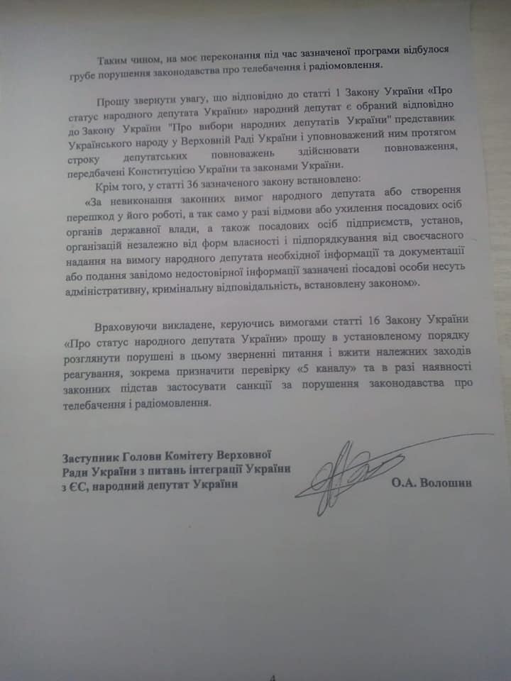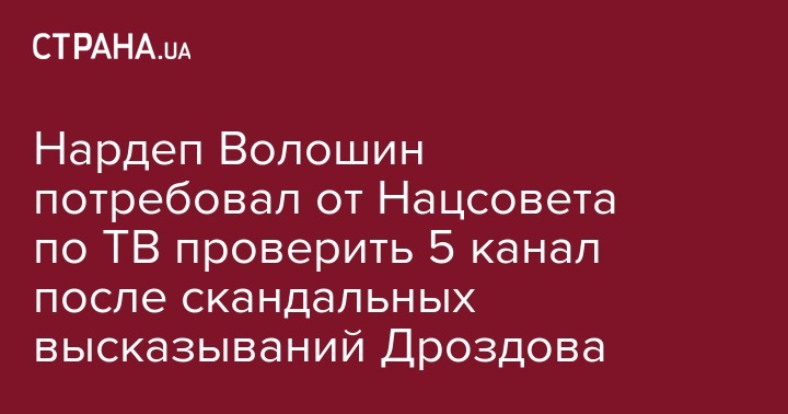 Народный депутат фракции "Оппозиционная платформа - За жизнь" Олег Волошин заявил об обращении в Нацсовет по телевидению и радиовещанию с требованием провести проверку принадлежащего Петру Порошенко "5 канала" после того, как журналист и ведущий Остап Дроздов в прямом эфире потребовал лишить украинского гражданства всех жителей так называемой "ЛДНР".
