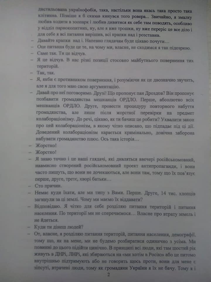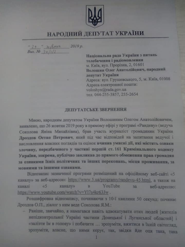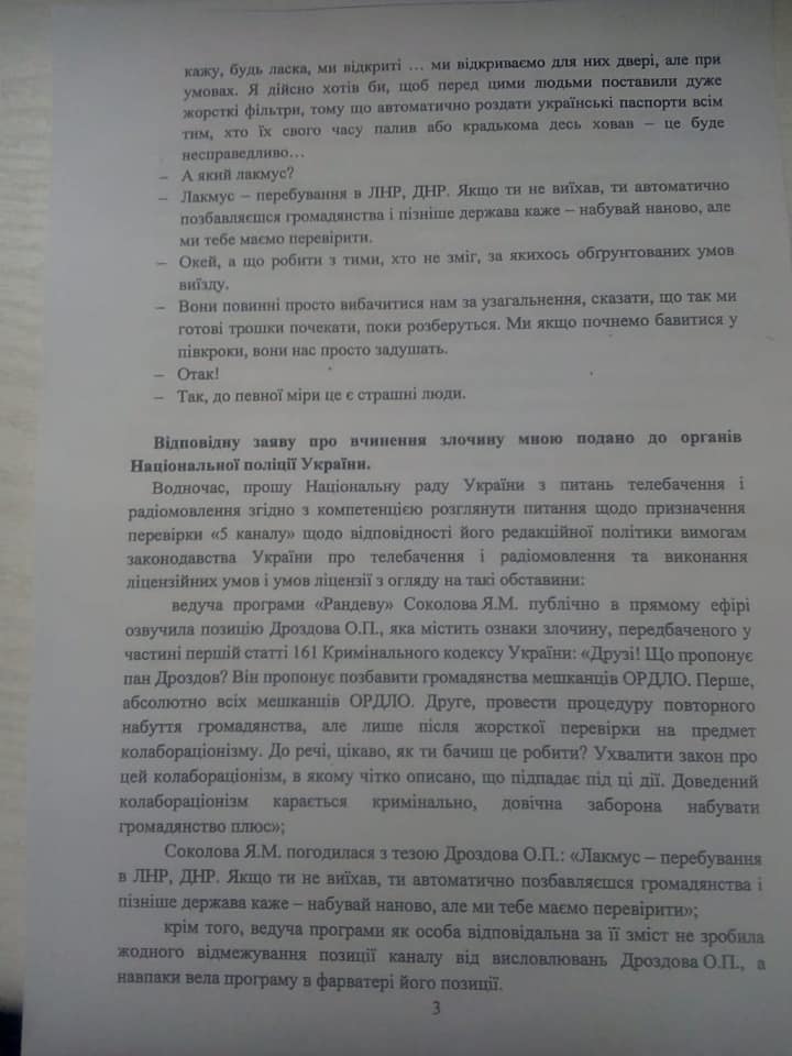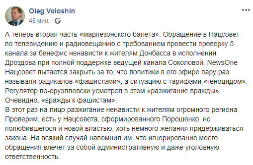 "А теперь вторая часть "марлезонского балета". Обращение в Нацсовет по телевидению и радиовещанию с требованием провести проверку 5 канала за бенефис ненависти к жителям Донбасса в исполнении Дроздова при полной поддержке ведущей канала Соколовой. NewsOne Нацсовет пытается закрыть за то, что политики в его эфире пару раз называли радикалов "фашистами", а ситуацию с тарифами "геноцидом". Регулятор по-оруэлловски усмотрел в этом "разжигание вражды". Очевидно, "вражды к фашистам".
