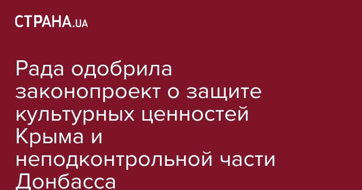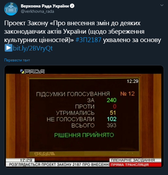 На заседании в среду, 30 октября, Верховная Рада приняла за основу законопроект №2187 о внесении изменений в некоторые законодательные акты Украины относительно сохранения культурных ценностей на оккупированных территориях. Об этом в Twitter сообщила пресс-служба парламента.