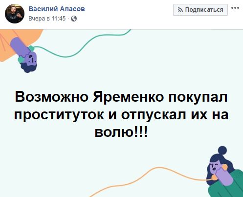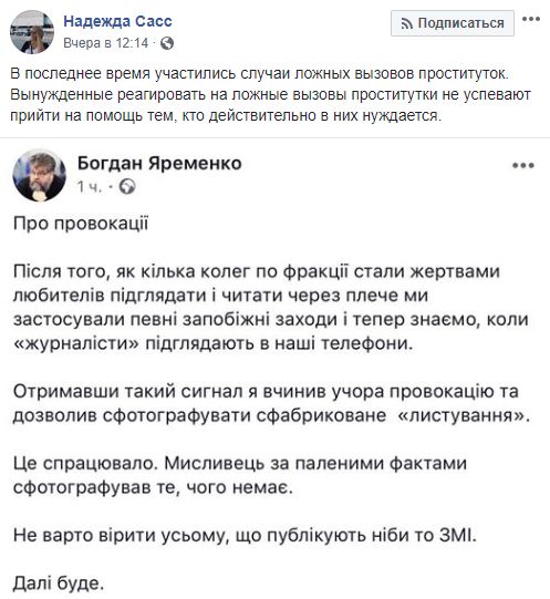 Журналист Надежда Сасс прокомментировала скриншот поста Яременко, который тот позже удалил: "В последнее время участились случаи ложных вызовов проституток. Вынужденные реагировать на ложные вызовы проститутки не успевают прийти на помощь тем, кто действительно в них нуждается".