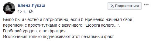 Юрист Елена Лукаш также говорит о том, что поступок Яременко характеризует и всю фракцию: "Было бы и честно и патриотично, если б Яременко начинал свои переписки с проститутками с вежливого: "Дорога колего...".