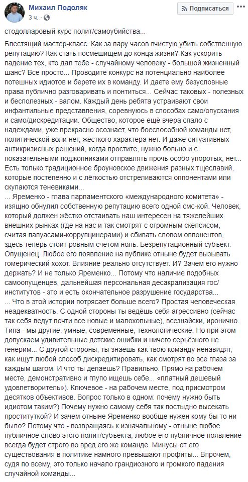 Яременко - глава парламентского "международного комитета" - изящно обнулил собственную репутацию всего одной смс-кой. Человек, который должен жёстко отстаивать наш интересен на тяжелейших внешних рынках (где на нас и так смотрят с огромным скепсисом, считая папуасами-коррупцинерами) и сбивать словом оппонентов, здесь теперь стоит ровным счётом ноль. Безрепутационный субъект. Опущенец. Любое его появление на публике отныне будет вызывать гомерический хохот. Влияние реально отсутствует. И? Зачем его нужно держать? И не только Яременко. Потому что наличие подобных самоопущенцев, дальнейшая персональная десакрализация гос/институтов - это и есть окончательное разрушение государства.
