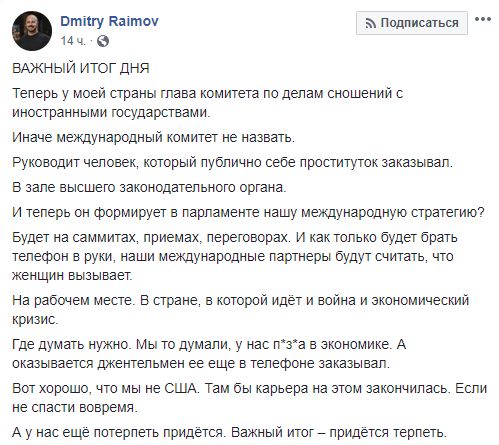 Политтехнолог Дмитрий Раимов: "Теперь у моей страны глава комитета по делам сношений с иностранными государствами. Иначе международный комитет не назвать. Руководит человек, который публично себе проституток заказывал. В зале высшего законодательного органа. И теперь он формирует в парламенте нашу международную стратегию?