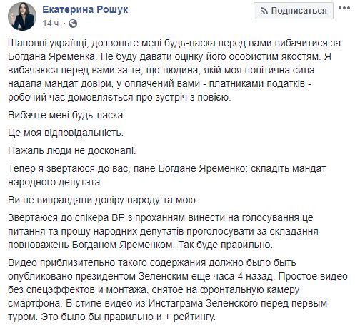 "Уважаемые украинцы, позвольте мне пожалуйста перед вами извиниться за Богдана Яременко. Не буду давать оценку его личным качествам. Я извиняюсь перед вами за то, что человек, которому моя политическая сила предоставила мандат доверия, в оплаченное вами - налогоплательщиками - рабочее время договаривается о встрече с проституткой.