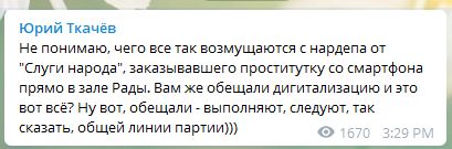 Журналист Юрий Ткачев: "Не понимаю, чего все так возмущаются с нардепа от "Слуги народа", заказывавшего проститутку со смартфона прямо в зале Рады. Вам же обещали дигитализацию и это вот всё? Ну вот, обещали - выполняют, следуют, так сказать, общей линии партии".