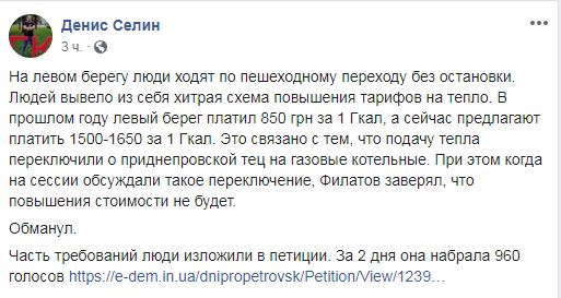 "На левом берегу люди ходят по пешеходному переходу без остановки. Людей вывела из себя хитрая схема повышения тарифов на тепло. В прошлом году левый берег платил 800 грн за 1 Гкал, а сейчас предлагают платить 1650 грн, - написал Денис Селин. По его словам, это связано с тем, что подачу тепла переключили с Приднепровской ТЭС на газовые котельные. "При этом, когда на сессии обсуждали такое переключение, Филатов уверял, что повышения не будет", - сообщил Селин.