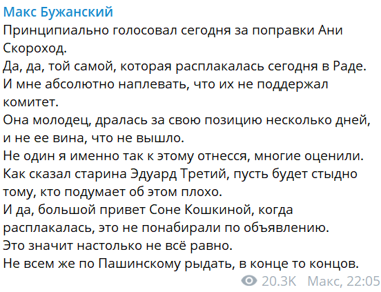 В тот же день нардеп от "Слуги народа" Максим Бужанский уточнил, что правки Скороход комитет не прошли. Но он все равно за них проголосовал.