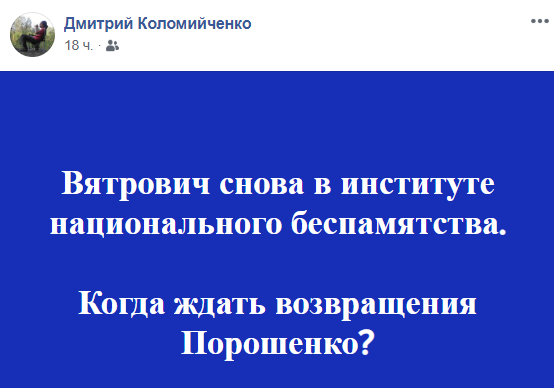 "Вятрович снова в институте национального беспамятства. Когда ждать возвращения Порошенко?", - пишет блогер Дмитрий Коломийченко.