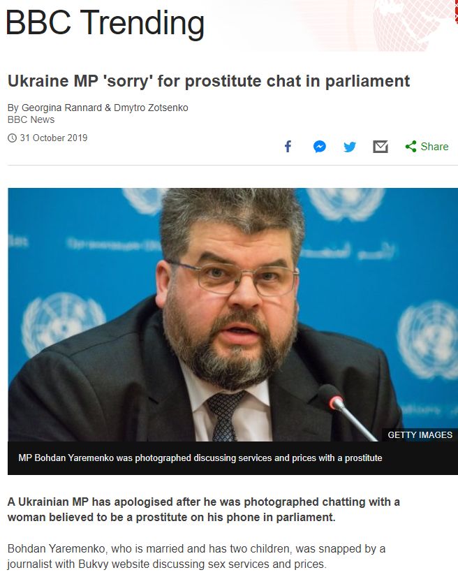 Так, на сайте Би-би-си в новости говорится: "Украинский депутат принес извинения после того, как его сфотографировали в парламенте беседующим в чате с женщиной, которая предположительно является проституткой". В статье рассказывается о том, как сначала Яременко заявил, что переписка была намеренной провокацией, а затем удалил свой пост.
