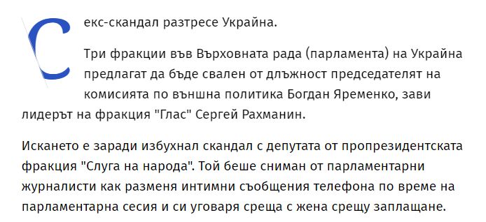 Болгарские "Вести" пишут о том, что Яременко могут исключить из фракции за интимную переписку на работе. По словам трех фракций, стремящихся отстранить Яременко от должности, его поведение содержит "элементы оскорбления законодательной власти и заявления, которые могут быть истолкованы как угроза для журналистов, что недопустимо и неприемлемо", говорится в статье.